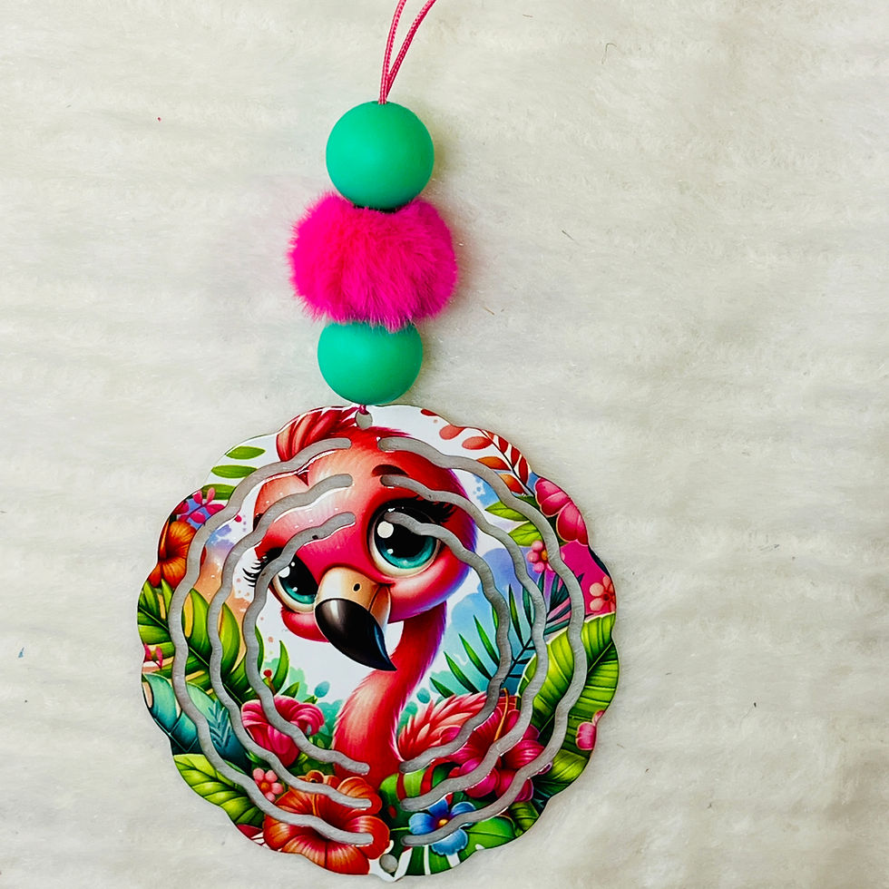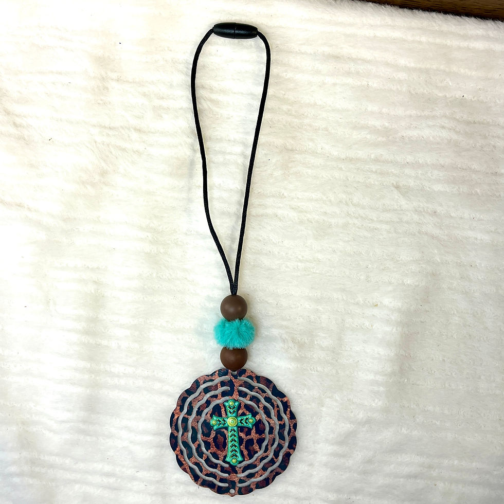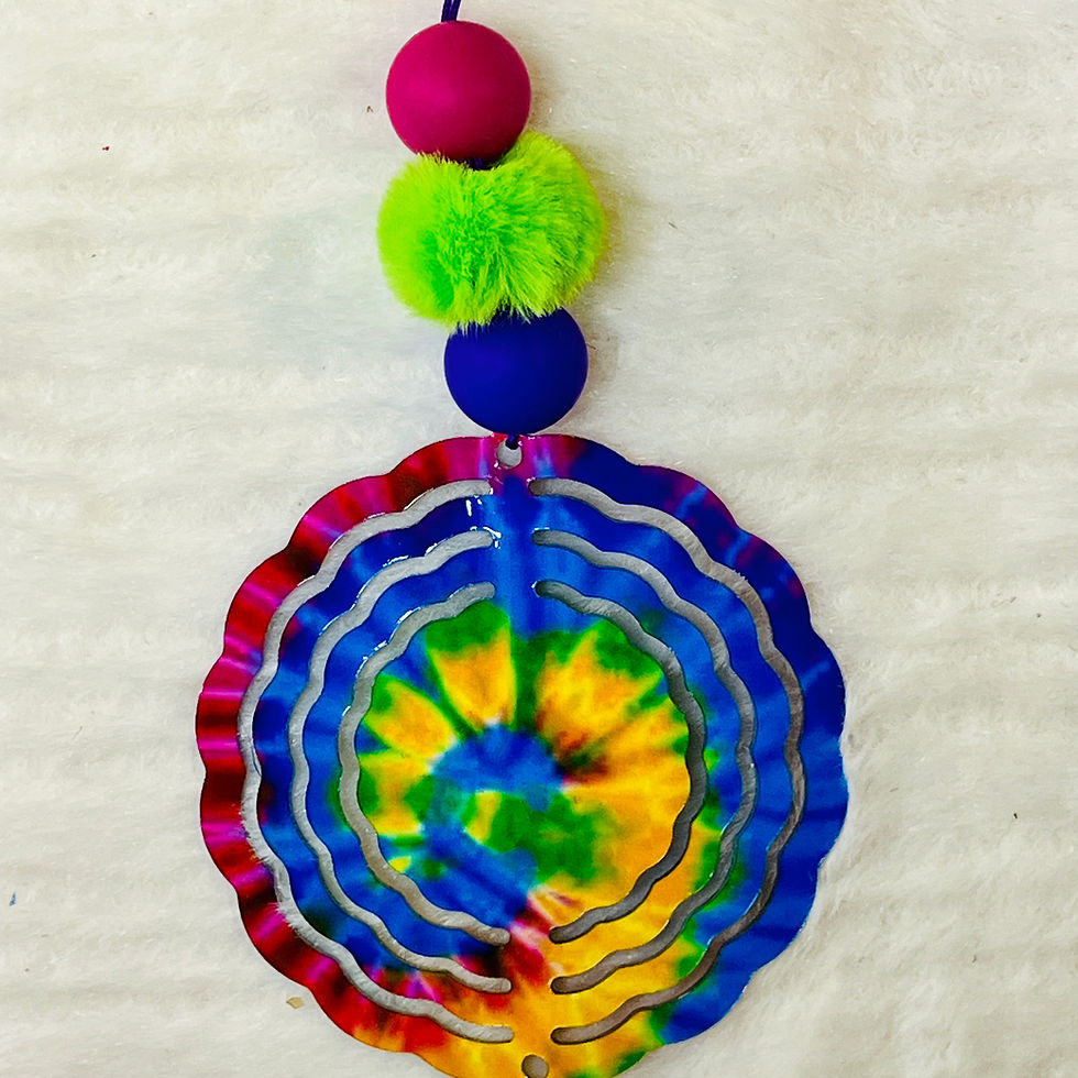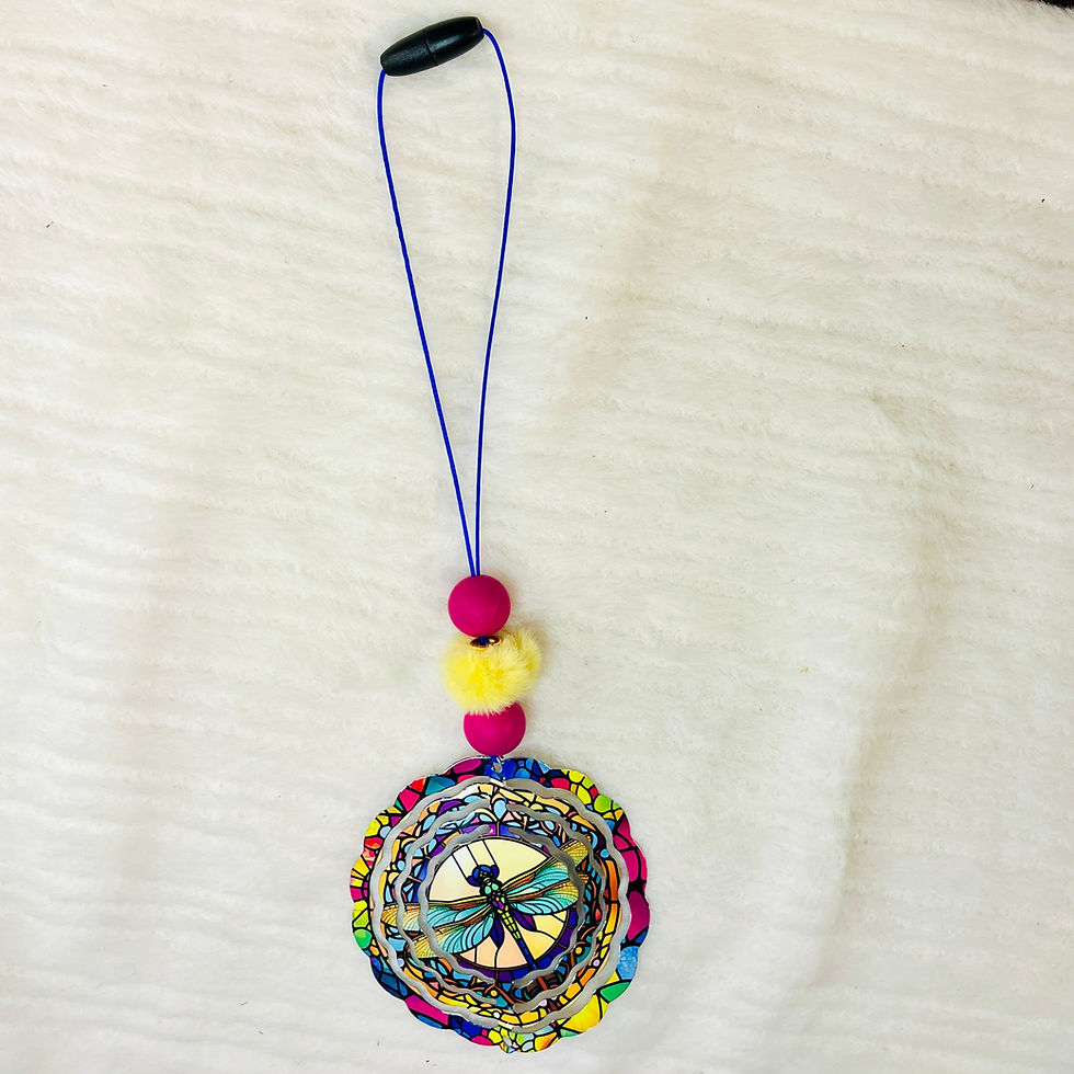 Our Car Charms are like little miniature designs of our wind spinners. They are 3" in diameter. They hang from your rear view mirror in your car. Each car charm comes with a break away clasp for easy hanging.